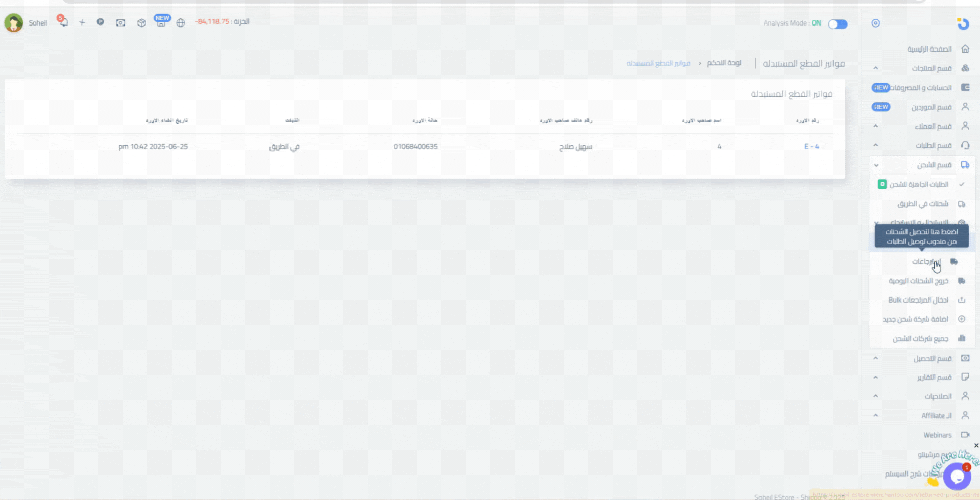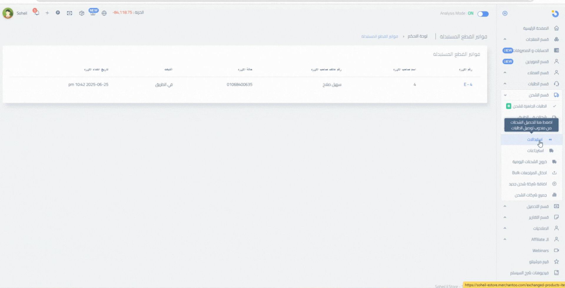 للاطلاع على قائمة المنتجات التى تم استرجاعها قم بالضط على قسم الشحن ثم الاستبدالات والاسترجاع ثم استرجاعات